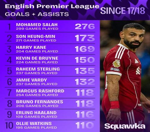 1718赛季以来英超参与进球数榜:萨拉赫第一,孙凯分居二三