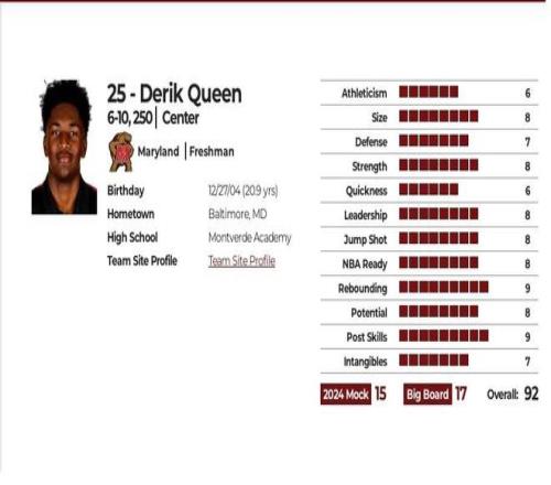 奎因的“全美第一中锋”名号是在高中时确立的,2024年他高中毕业时依靠扎实稳定的内线得分能力获得ESPN综合评分93分,五星高中生,在全美中锋位置中高居第一,随后加入马里兰大学。